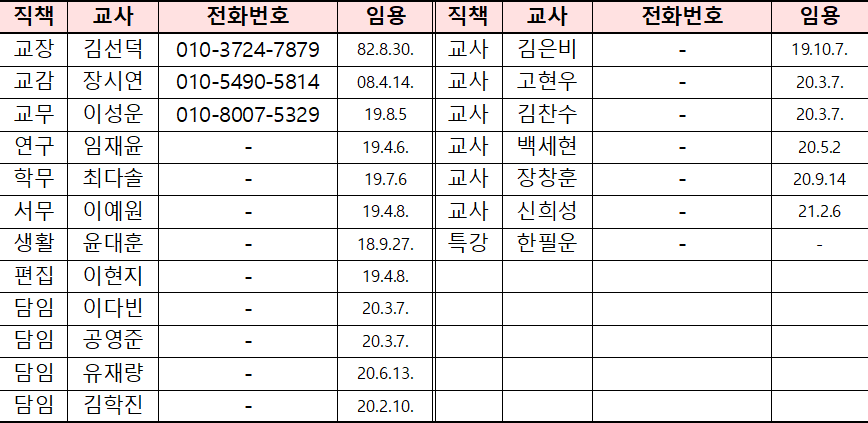 2020³â °¡À»Çб⠱³»çÇöȲ(4th) 2021.2.6(Åä) ÇöȲ ±³Àå 1, ±³°¨ 1, ±³»ç 16, º¯È£»ç 1 * ÀÓ¿ëÀÏÀÚ´Â È®½ÇÄ¡ ¾ÊÀ» °æ¿ì ¹æ¹®ÀÏÀÚ·Î ´ëüÇÕ´Ï´Ù.